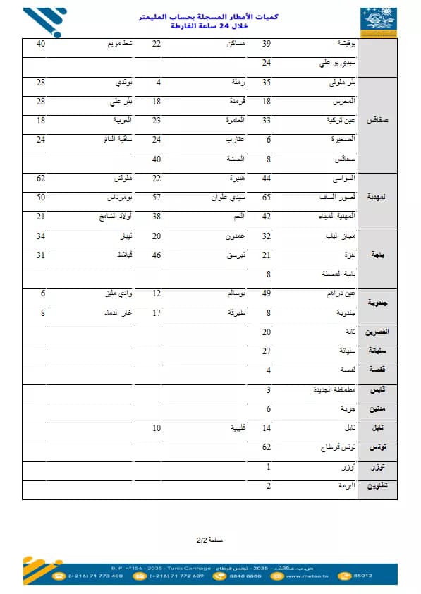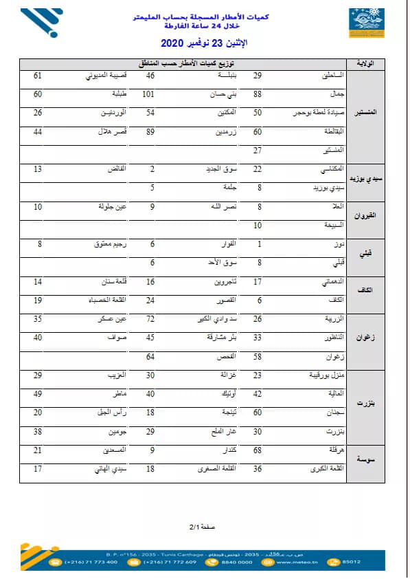 نشر المعهد الوطني للرصد الجوي كميات الأمطار المتساقطة بحساب المليميتر خلال الأربع وعشرين ساعة الأخيرة، وبلغت أكثر المعدلات بمعتمدية بني حسان من ولاية المنستير بـ101 مليمتر.