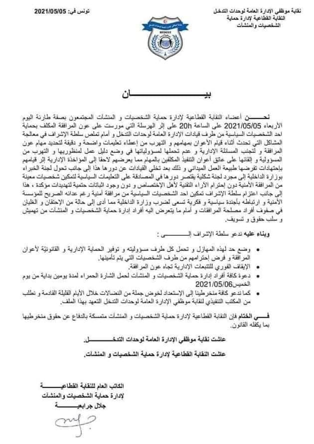 يحمل أعوان إدارة حماية الشخصيات والمنشآت الشارة الحمراء لمدة يومين بداية من اليوم الخميس 6 ماي 2021، بدعوة من النقابة القطاعية لإدارة حماية الشخصيات والمنشآت المجتمعة مساء أمس بصفة طارئة على خلفية "الهرسلة التي مورست على عون المرافقة المكلف بحماية احد الشخصيات السياسية من طرف قيادات الإدارة العامة لوحدات التدخل وأمام تملص سلطة الإشراف في معالجة المشاكل التي تحدث أثناء قيام الأعوان بمهامهم والتهرب من إعطاء تعليمات واضحة ودقيقة لتحديد مهام عون المرافقة".