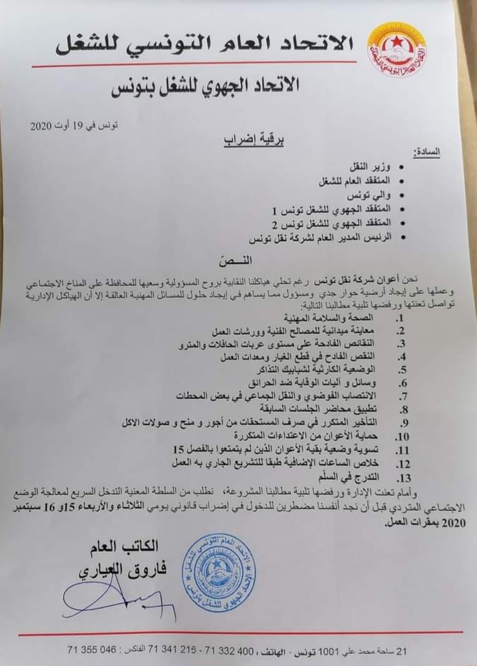 ووجهت النقابة لوزارة النقل والهياكل المعنية برقية إضراب تضمنت مطالب الأعوان التالية: