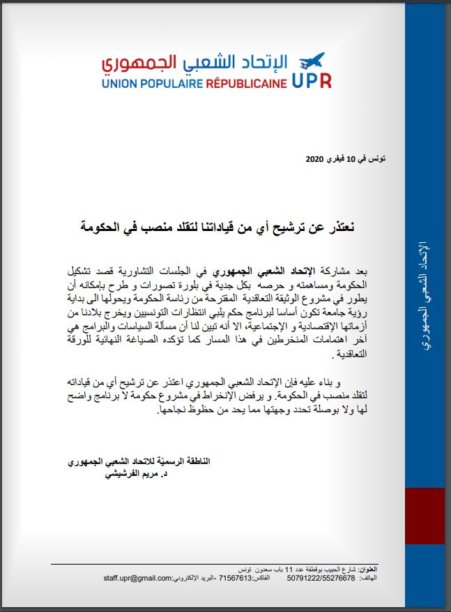 اعتذر حزب الاتحاد الشعبي الجمهوري عن ترشيح أيّ من قياداته لتقلّد منصب في الحكومة، كما عبّر عن رفضه الانخراط في مشروع الحكومة.