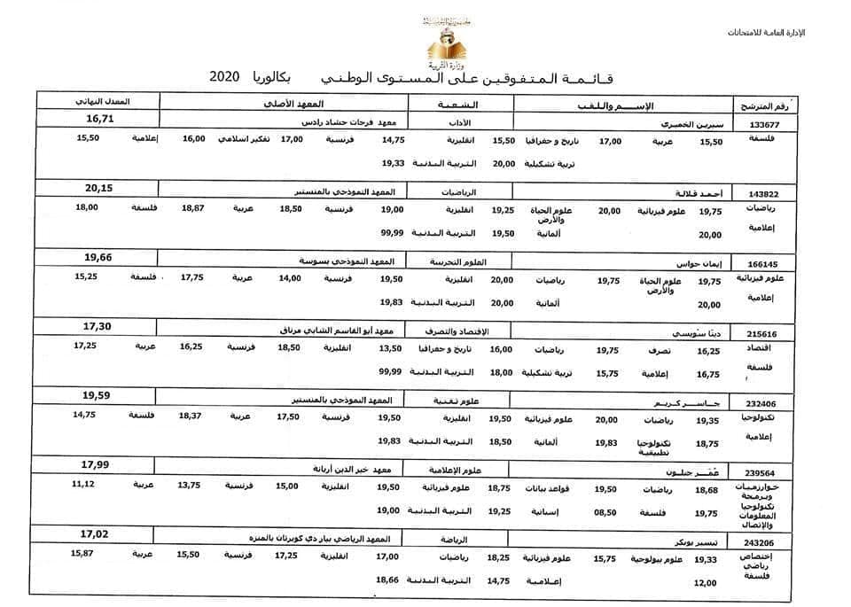 هذا ونشرت وزارة التربية قائمة المتفوقين على المستوى الوطني في الدورة الرئيسية لباكالوريا 2020، والتي جاءت كالآتي: