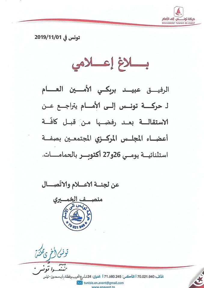 تراجع الأمين العام لحركة تونس إلى الأمام عبيد البريكي، عن الاستقالة بعد رفضها من قبل كافة أعضاء المجلس المركزي المجتمعين بصفة استثنائية يومي 26 و27 أكتوبر 2019 بالحمامات.