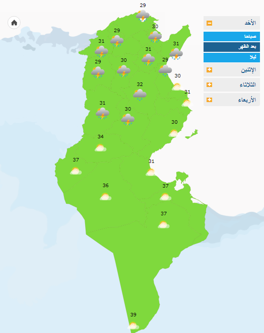 وستشهد درجات الحرارة انخفاضا طفيفا لتتراوح القصوى بين 27 و32 درجة بالشمال والمرتفعات وبجهة الساحل، وتكون بين 33 و37 ببقية الجهات كما تصل إلى 39 بالبرمة وبرج الخضراء..