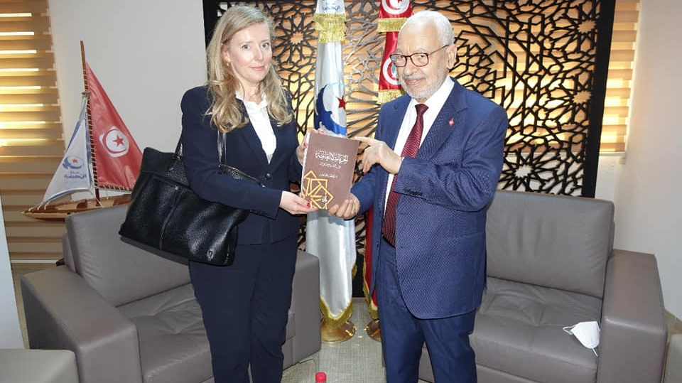 استقبل رئيس حركة النهضة ورئيس مجلس نواب الشعب المجمدة أشغاله، راشد الغنوشي، بمكتبه سفيرة المملكة المتحدة لدى تونس "هيلين ونترتون".