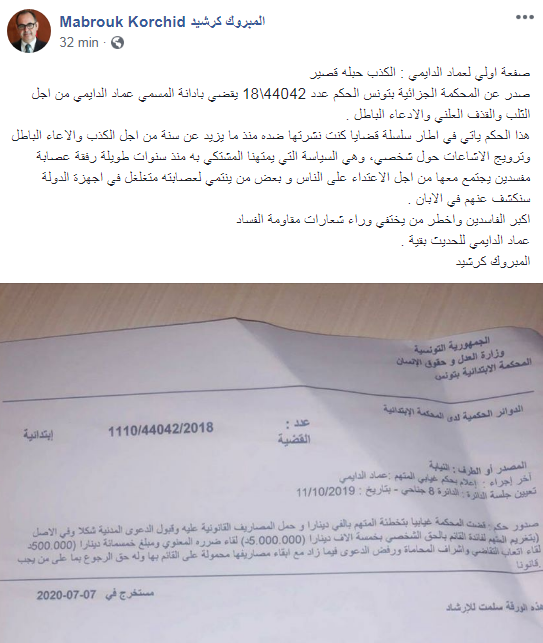 ويأتي هذا الحكم على خلفية القضية التي رفعها النائب مبروك كرشيد في 2019 ضد عماد الدايمي من أجل "الثلب والقذف العلني والادعاء بالباطل"، وقد قررت المحكمة في هذا الخصوص قبول الدعوى المدنية شكلا وفي الاصل.