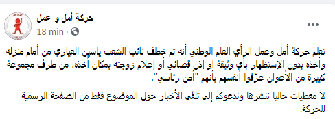 أعلنت حركة أمل وعمل ان الامن اوقف نائب الشعب ياسين العياري.
