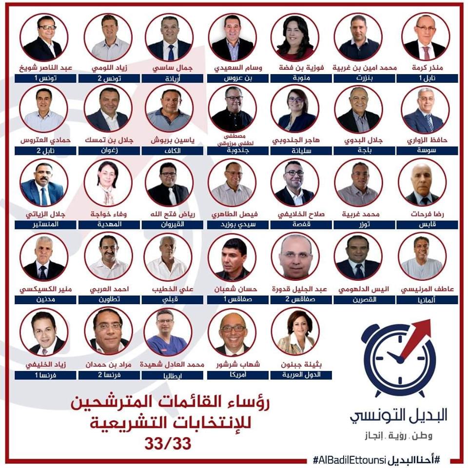وفي ما يلي رؤساء قائمات حزب البديل التونسي المترشحون للانتخابات التشريعية: