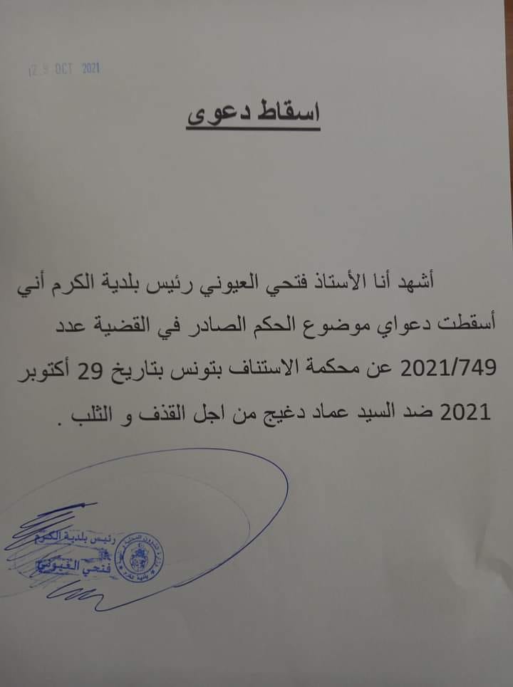 أعلن المحامي ورئيس بلدية الكرم فتحي العيوني، اليوم السبت 30 أكتوبر 2021، عن إسقاطه للدعوى القضائية ضد القيادي بائتلاف الكراكة عماد دغيج.
