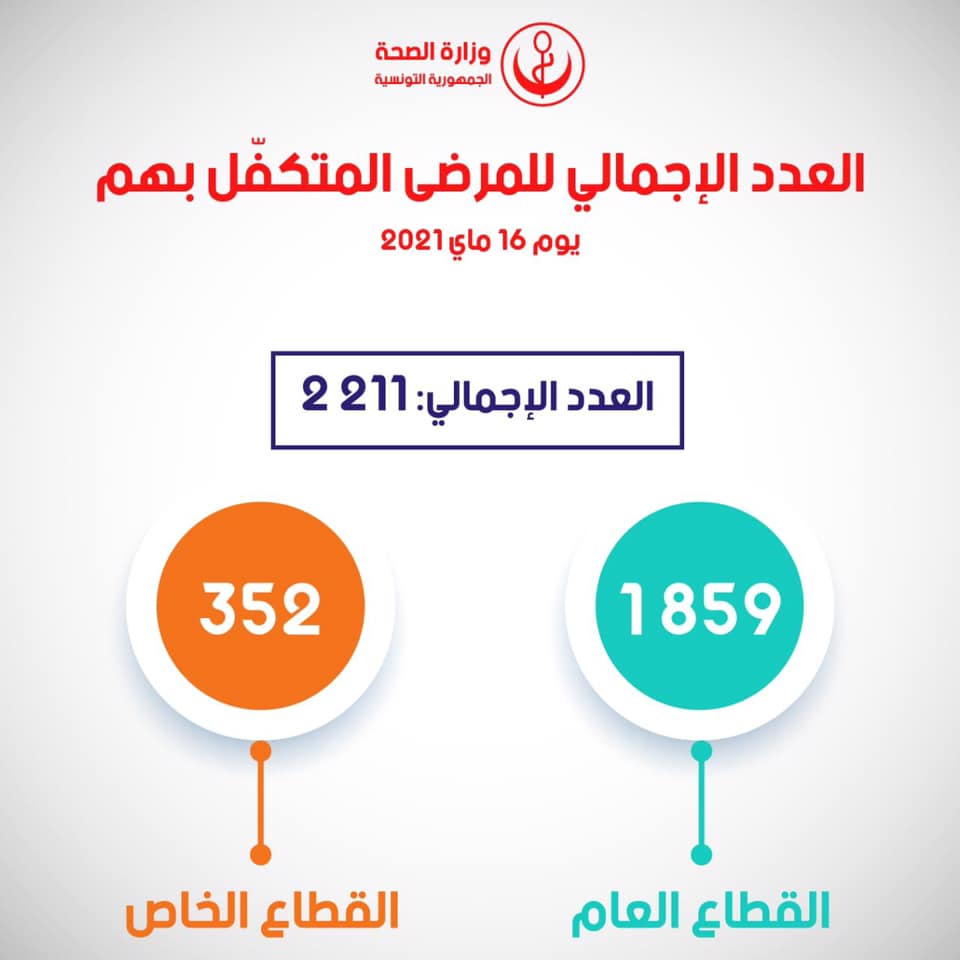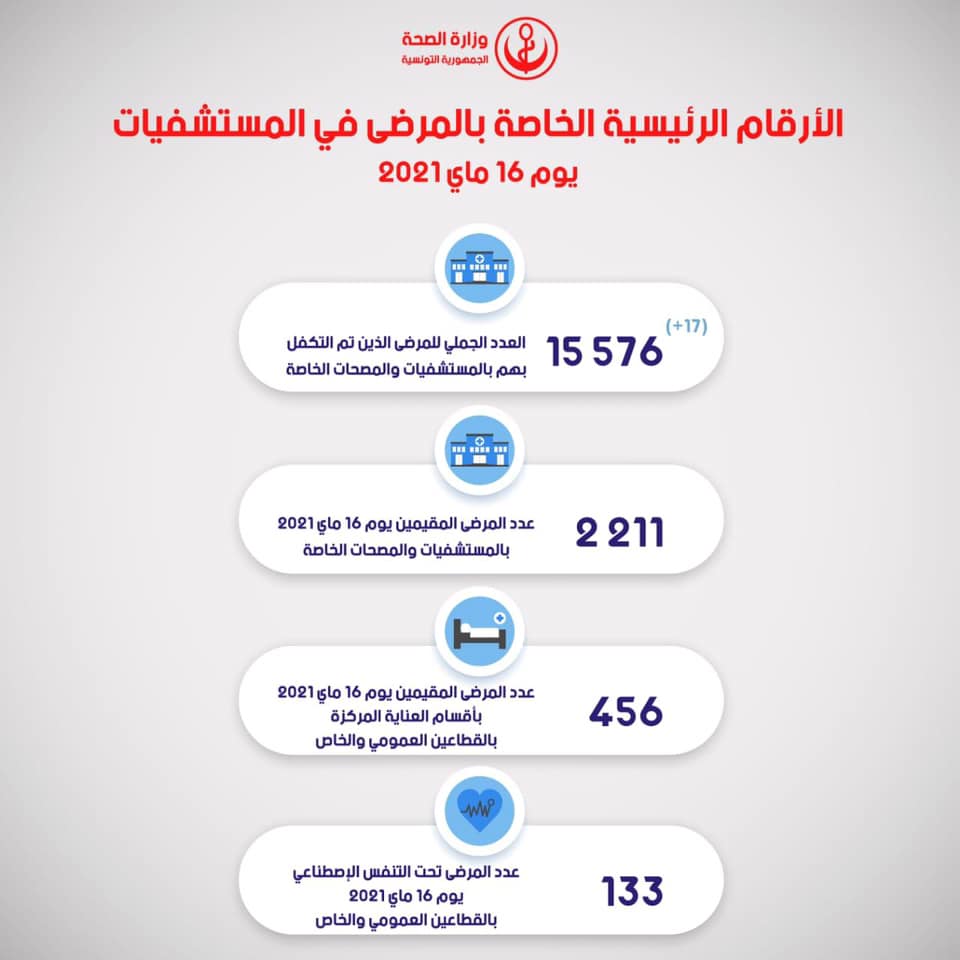 يشار إلى أن عدد المرضى المصابين بكوفيد 19 الذين تم التعهد بهم بالمؤسسات الصحية منذ بداية ظهور كوفيد-19 في فيفري 2020 إلى غاية 16 ماي الجاري قد بلغ نحو 15580 مريض.