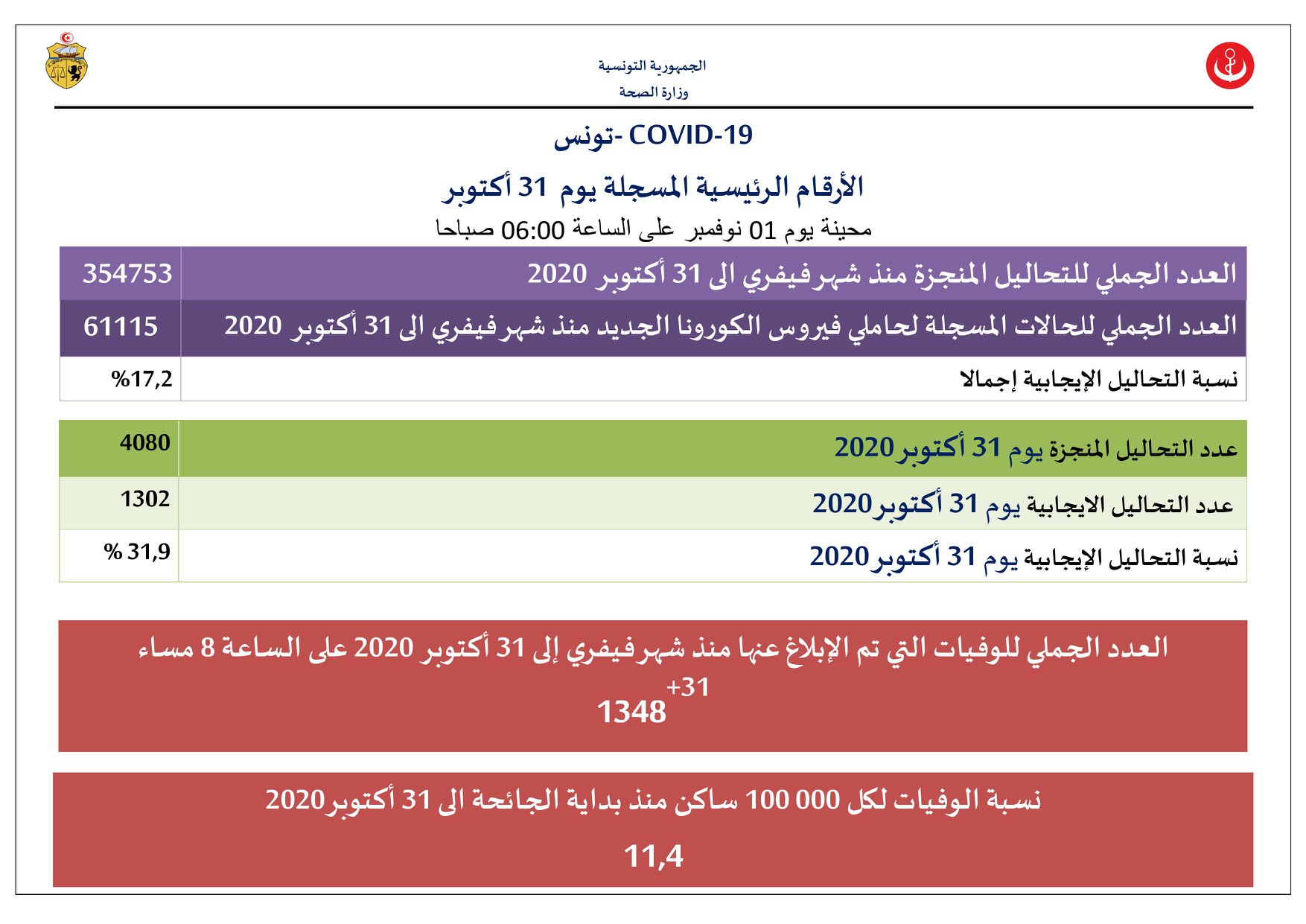 ووفق بلاغ الوزراة الصادر اليوم الاحد 1 نوفمبر 2020، فقد توفي يوم أمس 31 شخصا لبلغ العدد الجملي للوفيات إلى 1348 وفاة.
