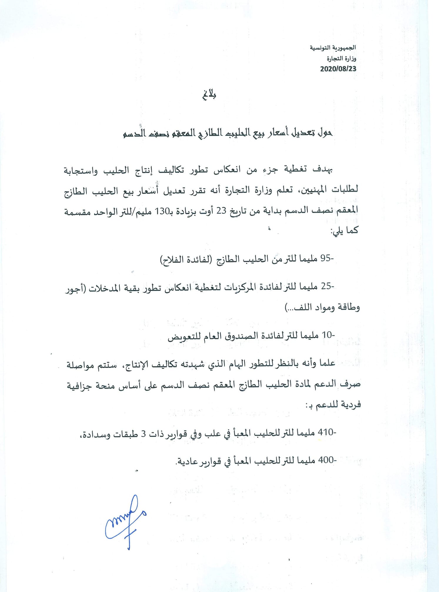 أعلنت وزارة التجارة انه تقرر الترفبع في سعر الحليب، بزيادة 130 مليم للتر الواحد انطلاقا من تاريخ 23 اوت 2020.
