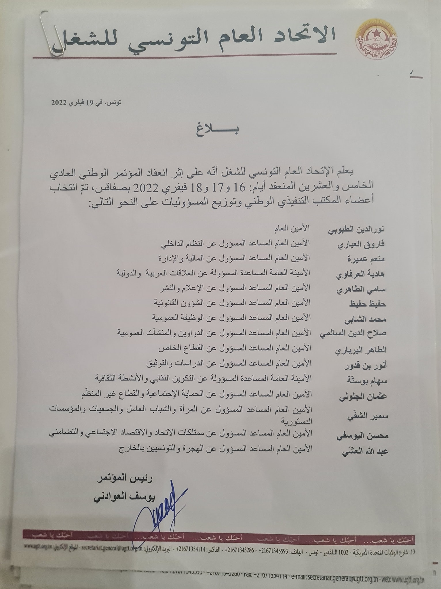 وأنهى المؤتمر الوطني الـ25 للاتحاد العام التونسي للشغل، أشغاله فجر اليوم السبت 19 نوفمبر 2022، بانتخاب 15 عضوا، وقد تم تجديد الثقة في نور الدين الطبوبي أمينا عامّا للمنظمة الشغيلة لدورة ثانية.