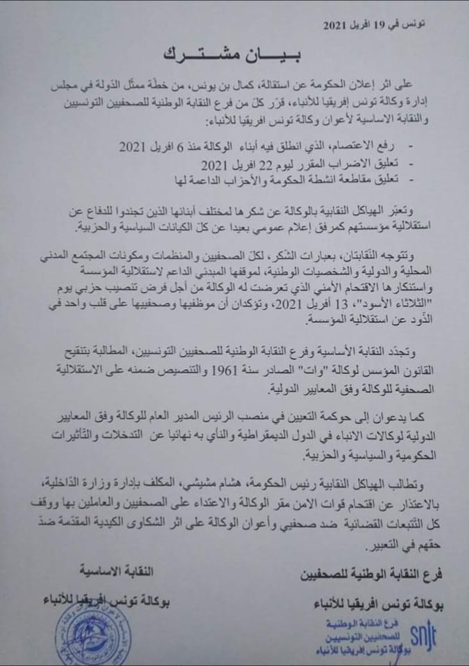 قرّر كلّ من فرع النقابة الوطنية للصحفيين التونسيين والنقابة الأساسية لأعوان وكالة تونس افريقيا للأنباء، رفع الاعتصام، الذي انطلق فيه أبناء الوكالة منذ 6 افريل 2021، وتعليق الاضراب المقرر ليوم 22 افريل 2021، وتعليق مقاطعة أنشطة الحكومة والأحزاب الداعمة لها.