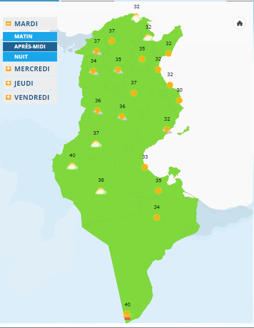 تتواصل الأجواء صيفية خالصة هذا اليوم، والجديد هو الارتفاع النسبي المرتقب في الحرارة لتصعد القصوى إلى مستوى 40/35 درجة مع ظهور الشهيلي، وتكون أقل نسبيا قرب السواحل حيث تتراوح بين 27 و32 درجة.