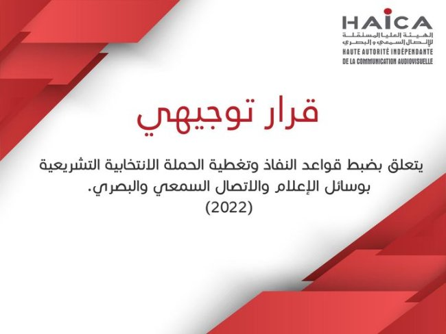 أصدر مجلس الهيئة العليا المستقلة للاتصال السمعي والبصري، اليوم الأربعاء 16 نوفمبر 2022، وفي إطار ولايته العامة على وسائل الإعلام والاتصال السمعي والبصري، واستنادا إلى مقتضيات الفصل 65 فقرة 02 من القانون الأساسي المتعلق بالانتخابات والاستفتاء، قرارا توجيهيا لوسائل الإعلام السمعي البصري يتضمن القواعد الأساسية الواجب احترامها لضمان شفافية التغطية الإعلامية للحملة الانتخابية التشريعية ونزاهتها.