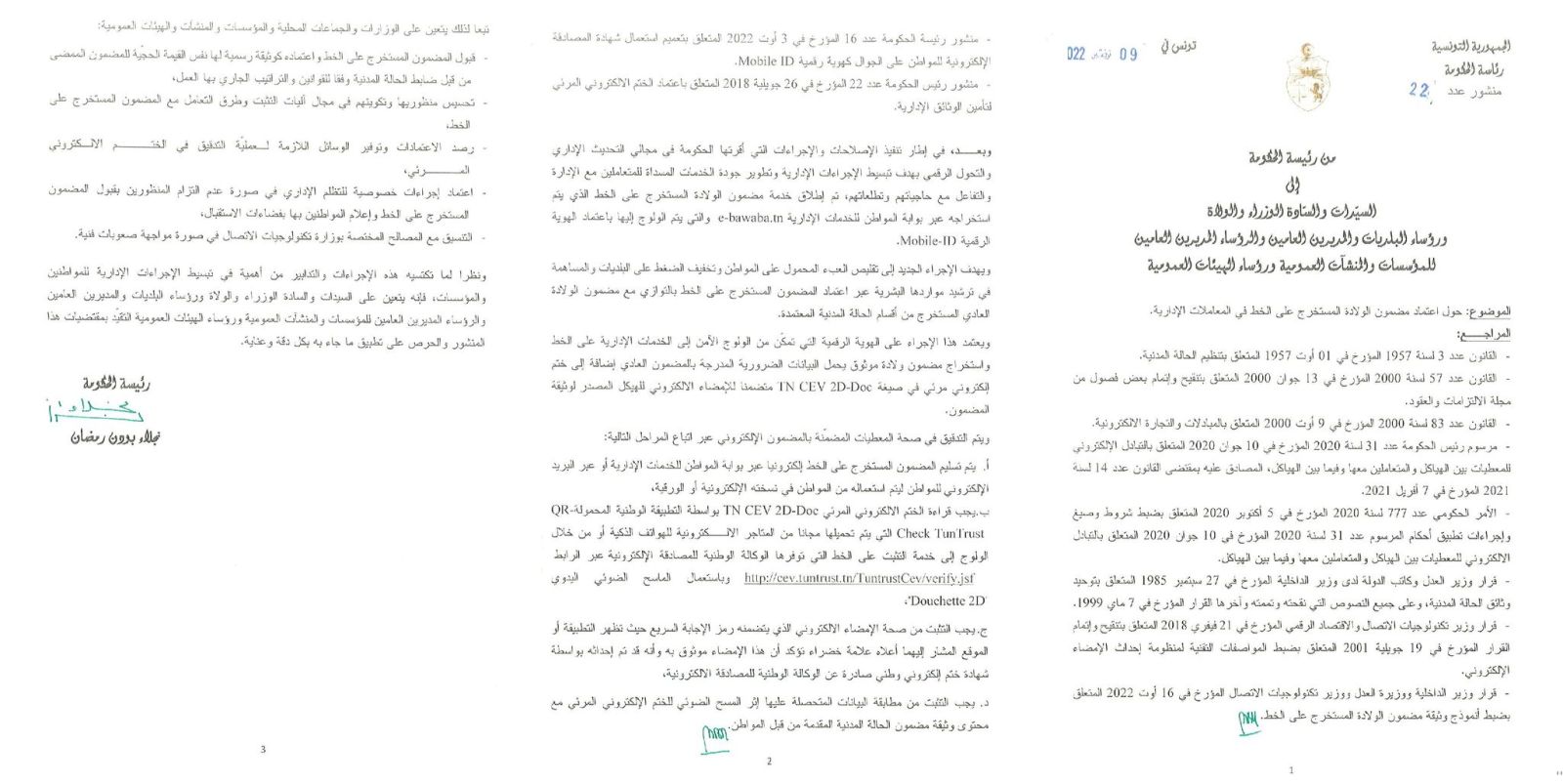 تمّ اليوم الخميس إصدار منشور رئاسة الحكومة عــــــــــــدد 22 بتاريخ 09 نوفمبر 2022 والمتعلق بإعتماد مضمون الولادة المستخرج على الخط في المعاملات الإدارية، حسب ما ورد في تدوينة نشرت على الصفحة الرسمية لوزارة تكنولوجيات الاتصال .