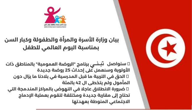 لمرأة والطفولة وكبار السن بمناسبة اليوم العالمي للطفل الموافق لــ20 نوفمبر من كل سنة،بيانا شددت فيه على التزام تونس باحترام تعهداتها الدولية ذات العلاقة بحقوق الطفل وعزمها الثابت على مزيد دعم مكتسبات الأطفال ومواصلة العمل قصد حماية الطفل من كلّ المخاطر ووقايته من سائر التهديدات لمصلحته الفضلى.ولاحظت الوزارة بأن الحق في التربية ما قبل المدرسية في تونس ما يزال دون المأمول ولم يتخطى الـ 42 بالمائة من الأطفال، مؤكدة عزمها على مواصلة تبني برنامج "الروضة العمومية" بالمناطق ذات الأولوية والعمل على إحداث 25 روضة جديدة بعد أن تولت إحداث 30 عمومية كدفعة أولى تسنى من خلالها تمتيع 1500 طفلا تونسيا إضافيا خلال شهر سبتمبر الماضي بحقّهم في التربية قبل مدرسية.