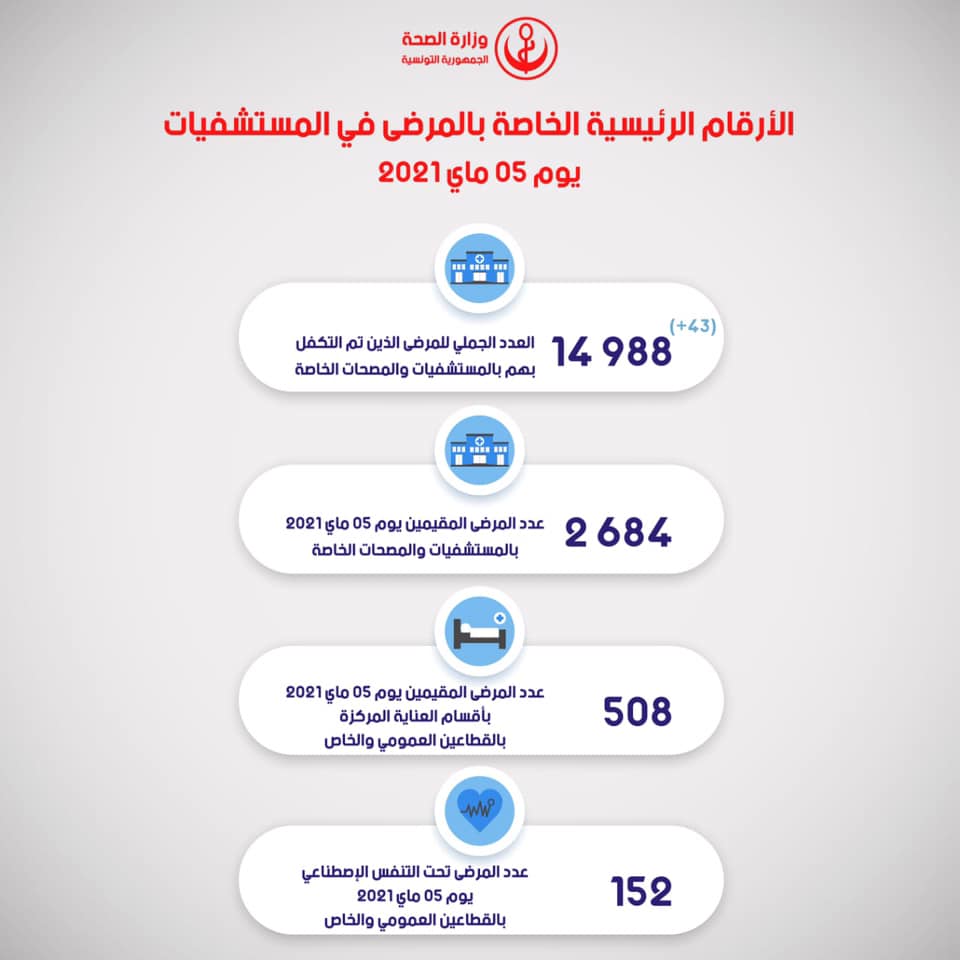 كشفت وزارة الصحة في آخر تحيين لها للوضع الوبائي المتعلق بفيروس كورونا، عن الأرقام الرئيسيّة المسجّلة بتاريخ 05 ماي 2021، حيث ارتفعت عدد الإصابات المعلنة منذ ظهور الفيروس إلى 317010 إصابة بعد تسجيل 1410 إصابة جديدة في التاريخ المذكور.