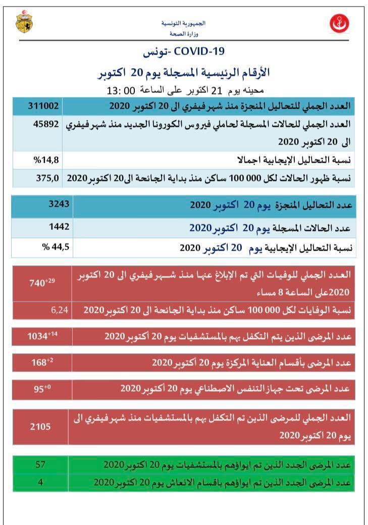 سجلت وزارة الصحة، بتاريخ 20 اكتوبر 2020، 1442 حالة إصابة جديدة بفيروس كورونا، من بين 3243 تحليلا، ليرتفع بذلك العدد الجملي للحالات المسجلة لحاملي الفيروس منذ شهر فيفري إلى 45892 حالة.