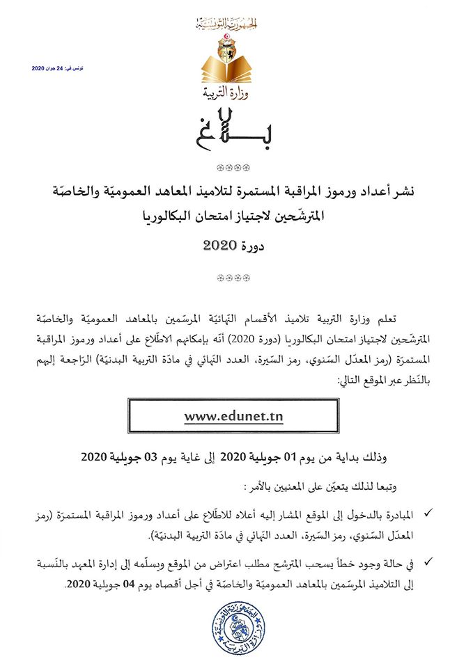 أعلنت وزارة التربية أنها ستنشر بداية من يوم 1 جويلية 2020، وإلى غاية يوم 3 جويلية 2020، أعداد ورموز المراقبة المستمرة لتلاميذ المعاهد العمومية والخاصة المترشحين لاجتياز امتحان الباكالوريا دورة 2020.