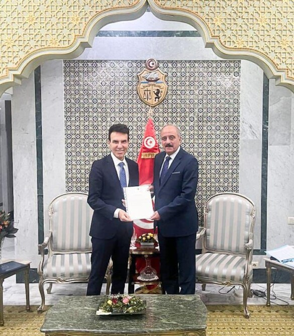 تسلّم وزير الشؤون الخارجية والهجرة والتونسيين بالخارج محمد علي النفطي، م الجمعة 6 سبتمبر 2024، نسخة من أوراق اعتماد سفير الاتحاد الأوروبي الجديد في تونس، جوزيبي بيروني.