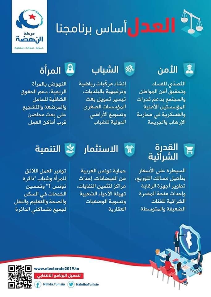 نشرت الصفحة الرسمية لحركة النهضة على موقع فايسبوك، البرنامج الانتخابي لقائمة الحزب المترشحة عن دائرة تونس 1، تضمنت جملة من التعهدات تتعلق بالأمن والشباب والمرأة.