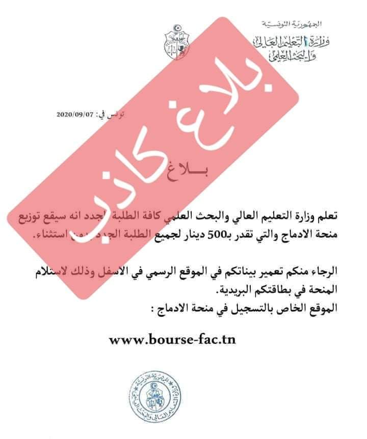 ويدعو البلاغ الكاذب الطلبة الجدد إلى الدخول إلى موقع واب مشبوه والإدلاء بمعطياتهم الخاصة للحصول على منحة وهو خبر كاذب لا أساس له من الصحة، وفق بلاغ وكالة السلامة المعلوماتنية الصادر اليوم الثلاثاء 8 سبتمبر 2020.