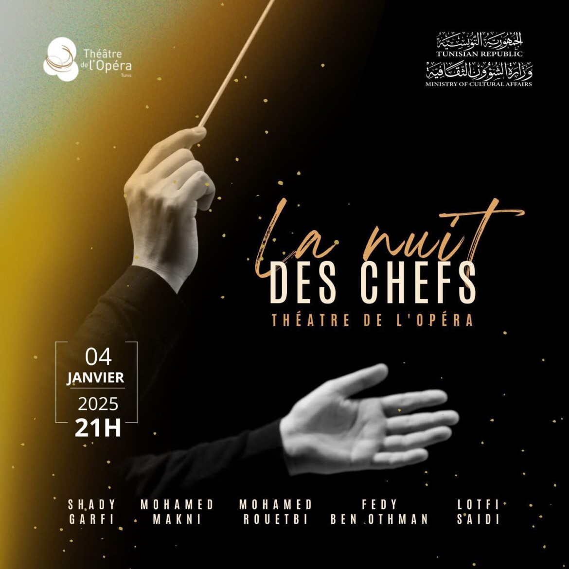 ينظم مسرح الأوبرا يوم السبت 04 جانفي 2025 سهرة قائدي الأوركستر تحت إشراف وزارة الشؤون الثقافية. ويشارك في هذه السهرة مجموعة من أبرز القائدين الموسيقيين في الساحة التونسية، وهم: شادي القرفي، محمد مقني، فادي بن عثمان ومحمد الرواتبي.