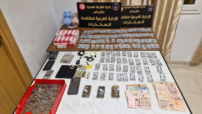 وقد جرى ضبط 3 أشخاص، من بينهم فتاتان على متن سيارة قبل أن يتم تفتيش أحد المنازل بجهة حي النصر، حيث تمّ حجز 1200 قرص مخدر من نوع “بريغابالين” وحوالي 100 غرام “كوكايين” و4 صفائح “زطلة” ومبلغ مالي.
