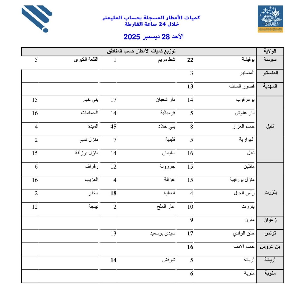 وحسب المعطيات المسجّلة، تصدّرت بني خلاد من ولاية نابل قائمة المناطق الأكثر تهاطلاً بـ45 مم.