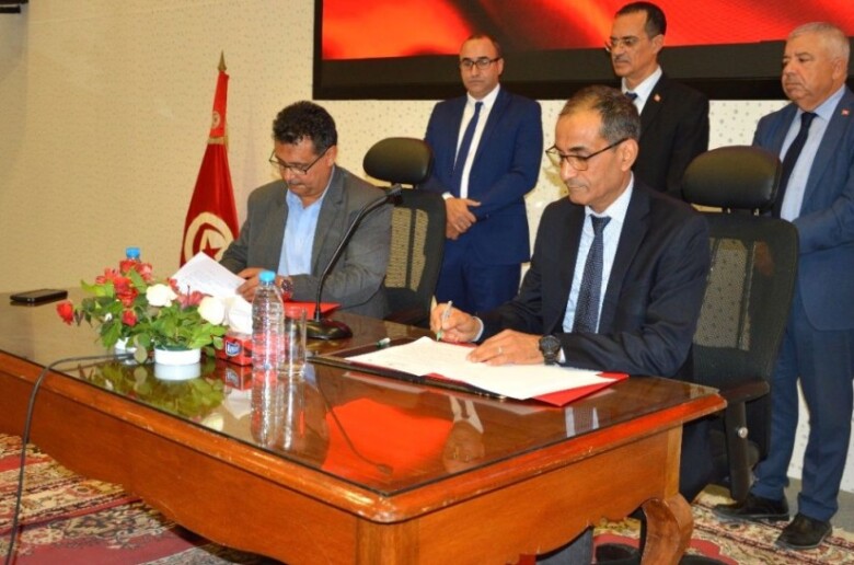 اشرف عزالدين بن الشيخ وزير الفلاحة والموارد المائية والصيد البحري على موكب توقيع اتفاقية تعاون وشراكة بين الديوان الوطني للأعلاف وديوان الأراضي الدولية لإنتاج قرط قصيبة بالمركبات الفلاحية ووحدات الإنتاج المسترجعة وعقود شراكة لإنتاج قرط قصيبة بالوحدات التعاضدية للإنتاج الفلاحي.
