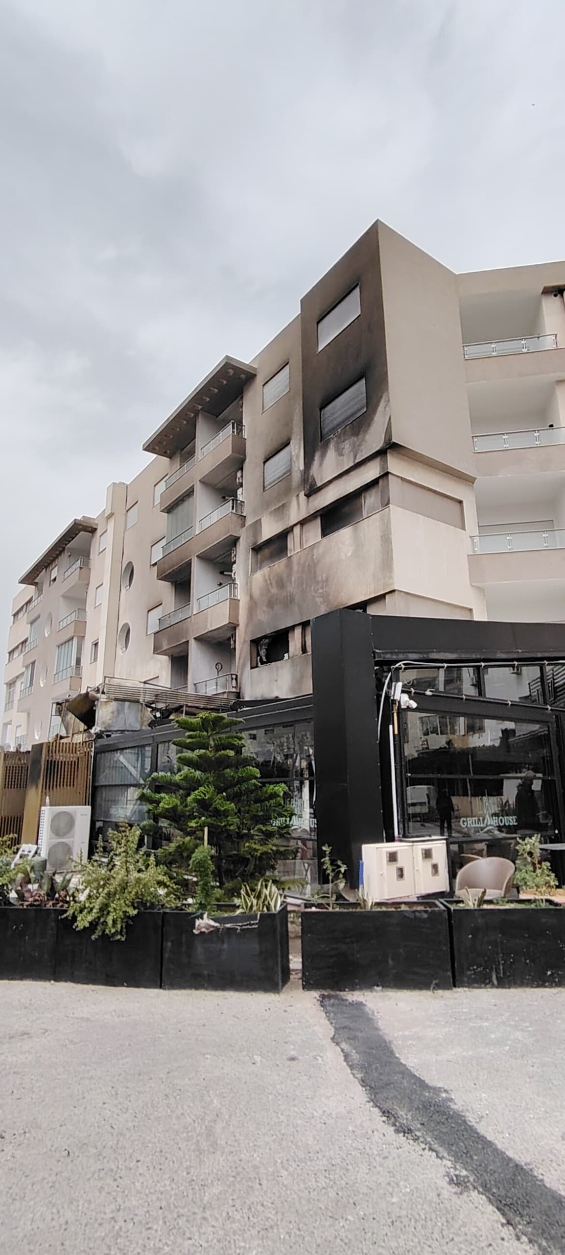 وقد أسفر الحريق عن أضرار مادية جسيمة طالت تجهيزات المطعم وواجهة البناية، فيما تُشير المعطيات الأولية إلى أنّ شرارة النيران انطلقت من إحدى “المشاوي” التابعة للمحل.