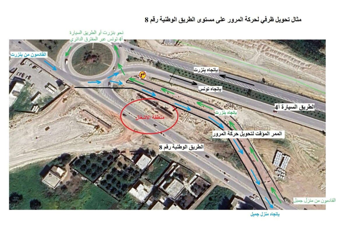 أعلنت الإدارة العامة للجسور والطرقات بوزارة التجهيز والإسكان في بلاغ لها أنه في إطار مشروع إنجاز الوصلة الدائمة لمدينة بنزرت قسط عدد1، سيتم بداية من يوم غد الإثنين 04 أوت 2025 ولمدة أربعة أشهر تحويل وقتي لجزء من الطريق الوطنية عدد 8 على مستوى تقاطعها مع الطريق السيارة أ4 بمنطقة الرمال من معتمدية جرزونة وذلك لإنجاز محول على مستوى هذا التقاطع.
