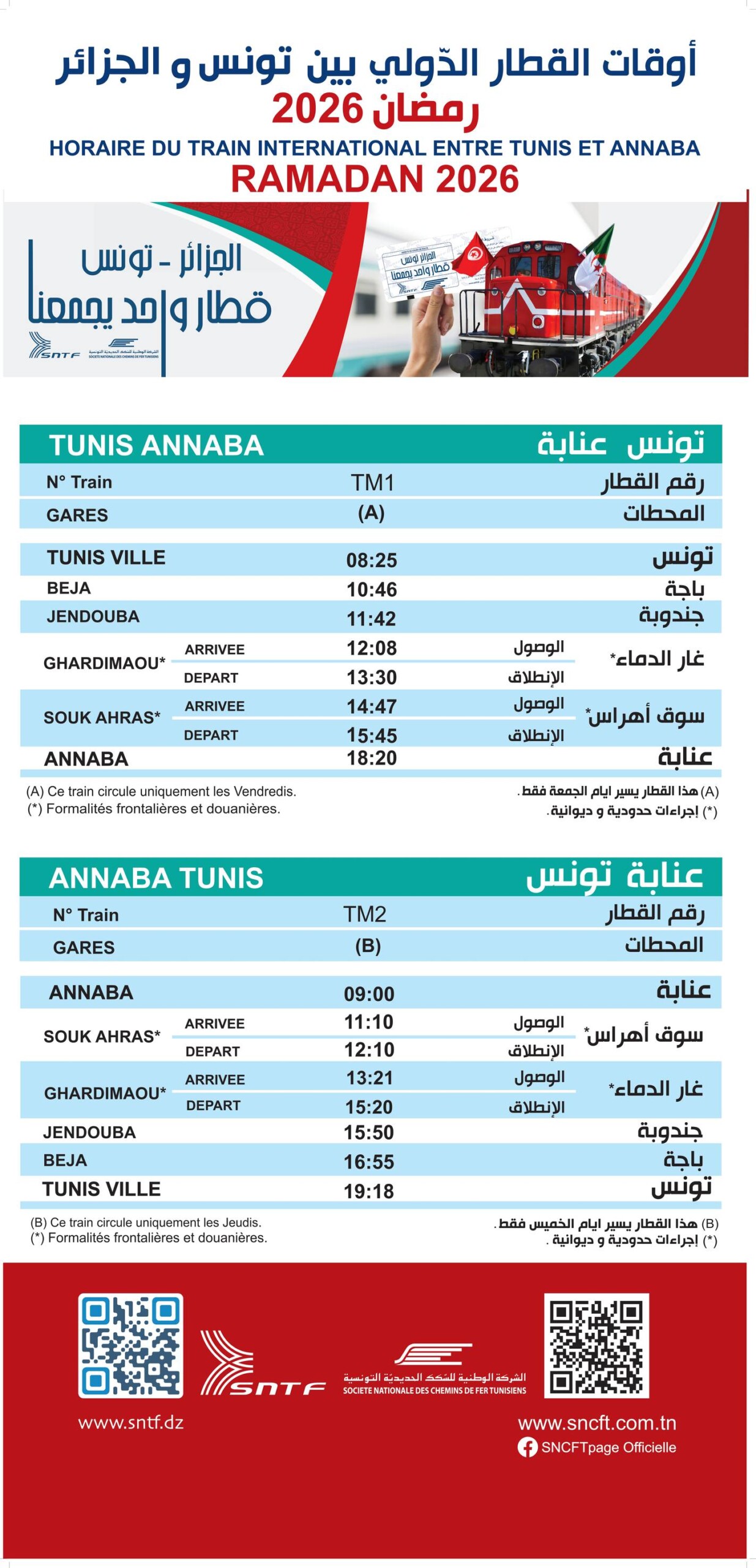 أعلنت الشركة الوطنية للسكك الحديدية عن إجراء تغيير استثنائي على سير القطار الدولي تونس – الجزائر بمناسبة حلول شهر رمضان المعظم لسنة 2026 وذلك بداية من يوم الخميس 19 فيفري 2026 إلى موفى شهر رمضان.