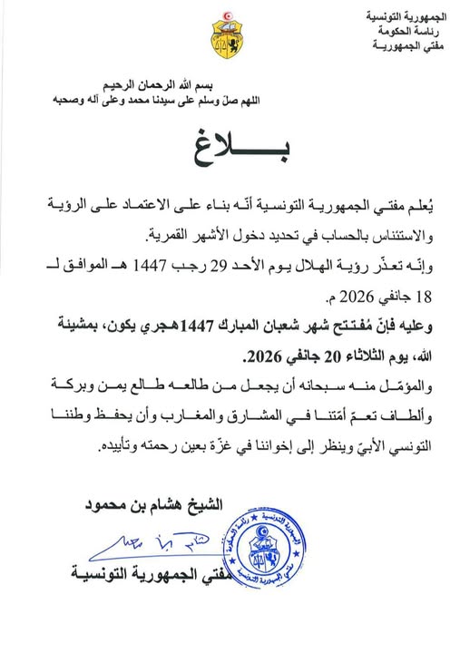 أفاد ديوان الإفتاء أنّ هلال شهر شعبان لم تتم رؤيته مساء امس الأحد 18 جانفي 2026 الموافق لـ29 رجب 1447 هـ، مما يجعل يوم الإثنين متمّمًا لشهر رجب.