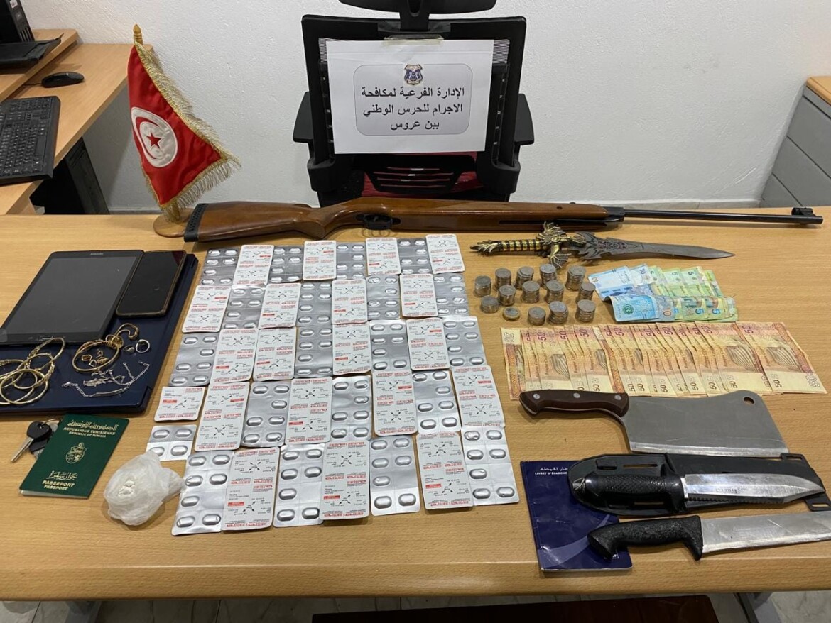 تمكنت الإدارة الفرعية لمكافحة الإجرام بإدارة الشؤون العدلية للحرس الوطني ببن عروس من القاء القبض على مروج مخدرات ينشط بين ولايات تونس الكبرى ، وفق الادارة العامة للحرس الوطني ، حيث تم التعريف بهوية ذي الشبهة إلى أن تم ضبطه داخل محل يستغله لترويج المواد المخدرة وتزوير العملة الورقية وحجز 63 قرص مخدر ومبلغا ماليا متأتيا من عائدات النشاط المذكور.