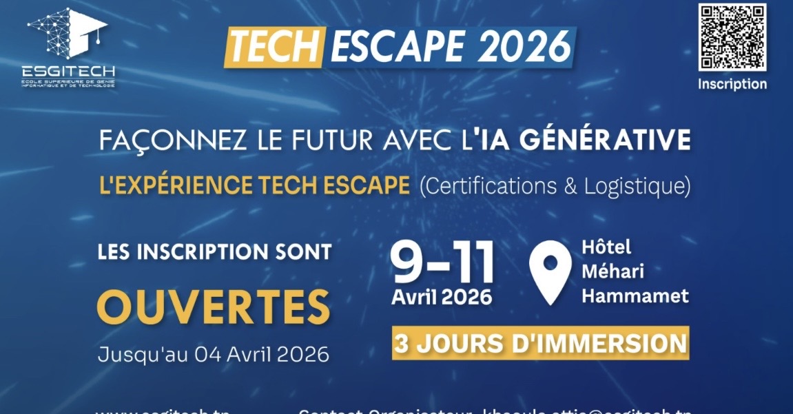 تستعدّ ESGITECH، أول جامعة خاصة متخصصة حصريًا في الإعلامية في تونس، لتنظيم فعالية “Tech Escape 2026” من 9 إلى 11 أفريل 2026 بمدينة الحمامات، في تظاهرة تجمع بين تجربة غامرة وهاكاثون مكثّف يتمحور حول الذكاء الاصطناعي التوليدي.