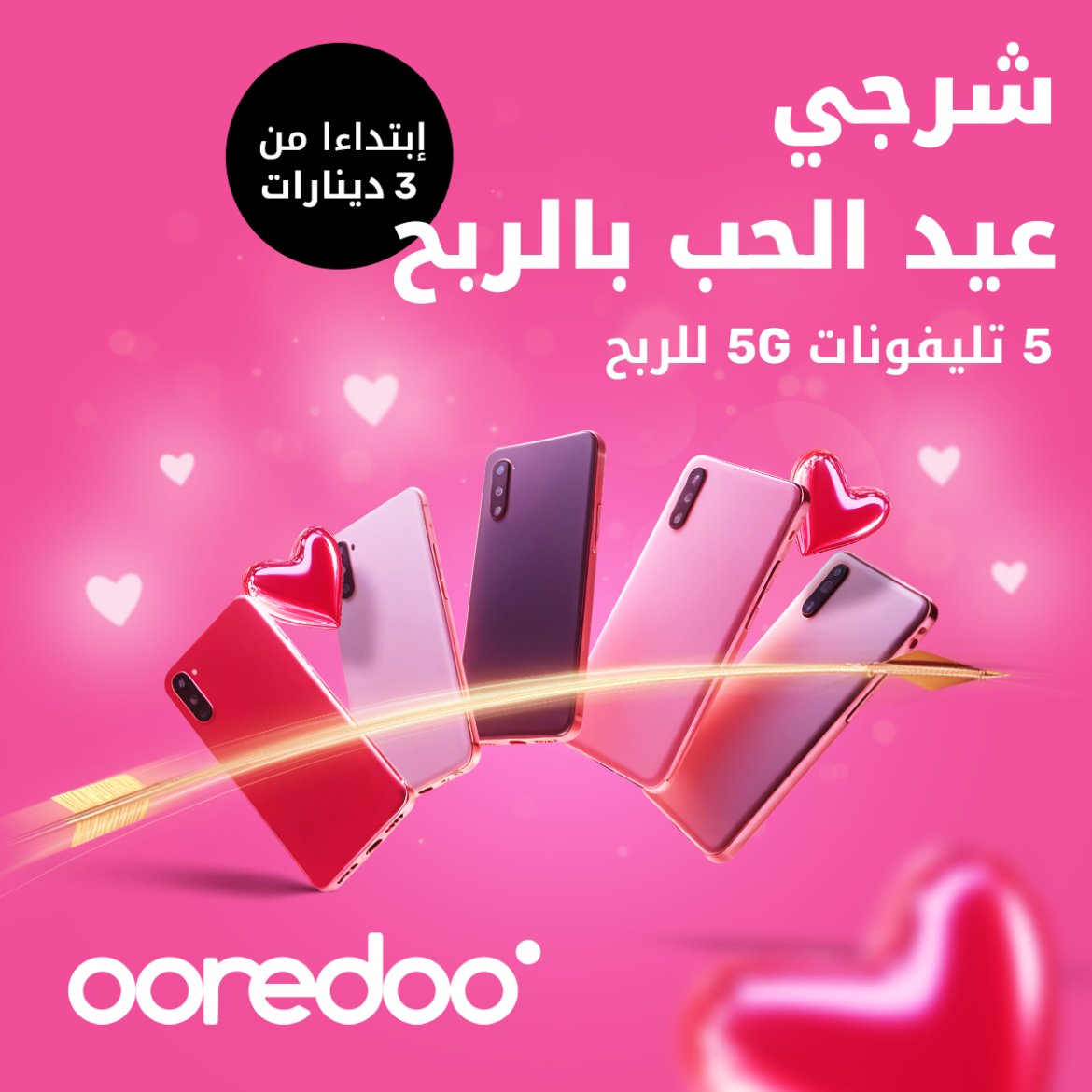 بمناسبة عيد الحب، تواصل Ooredoo تونس مفاجأة مشتركيها والاحتفاء معهم لجعل هذه المناسبة أكثر تميزًا وذلك من خلال إطلاق مسابقتها الاستثنائية “Valentine’s Day Game”. والتي تتيح الفرصة لجميع المشتركين للمشاركة والفوز بأحد الهواتف الذكية الخمسة المزودة بتقنية 5G المعروضة في هذه المسابقة بقيمة إجمالية تبلغ 20.000 دينار خلال الفترة الممتدة من 1 إلى 13 فيفري 2025.
