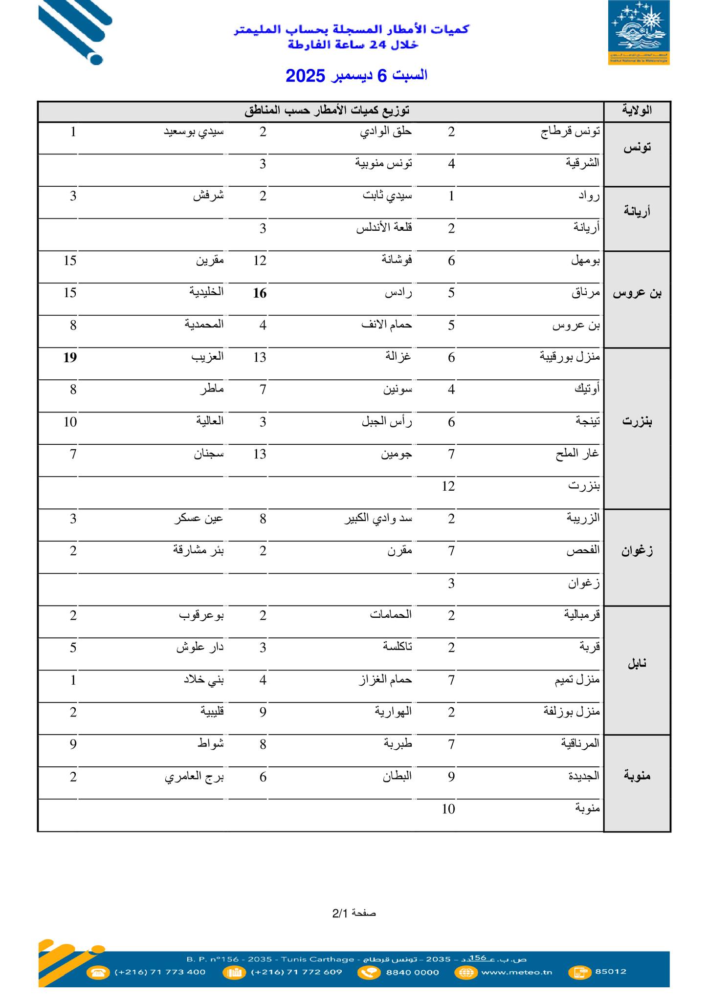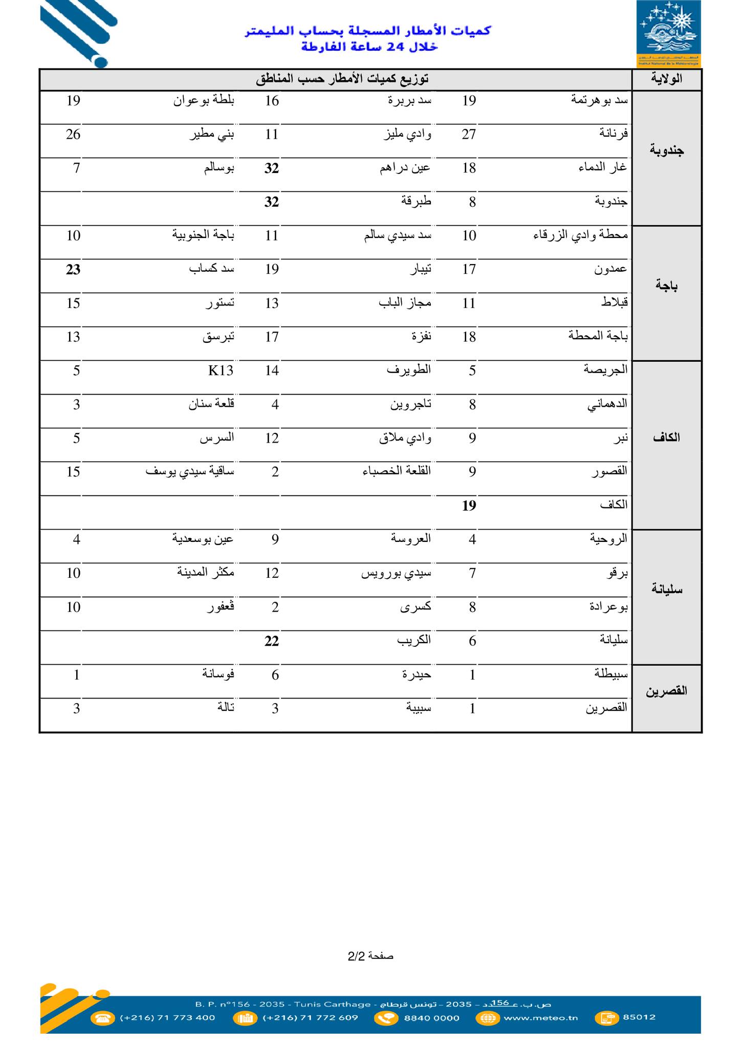 سجلت بعض المناطق خلال الـ24 ساعة الماضية نزول كميات متفاوتة من الأمطار تراوحت كمياتها بين 1 مم في مناطق كرواد والقصرين و32 مم في عين دراهم وطبرقة.