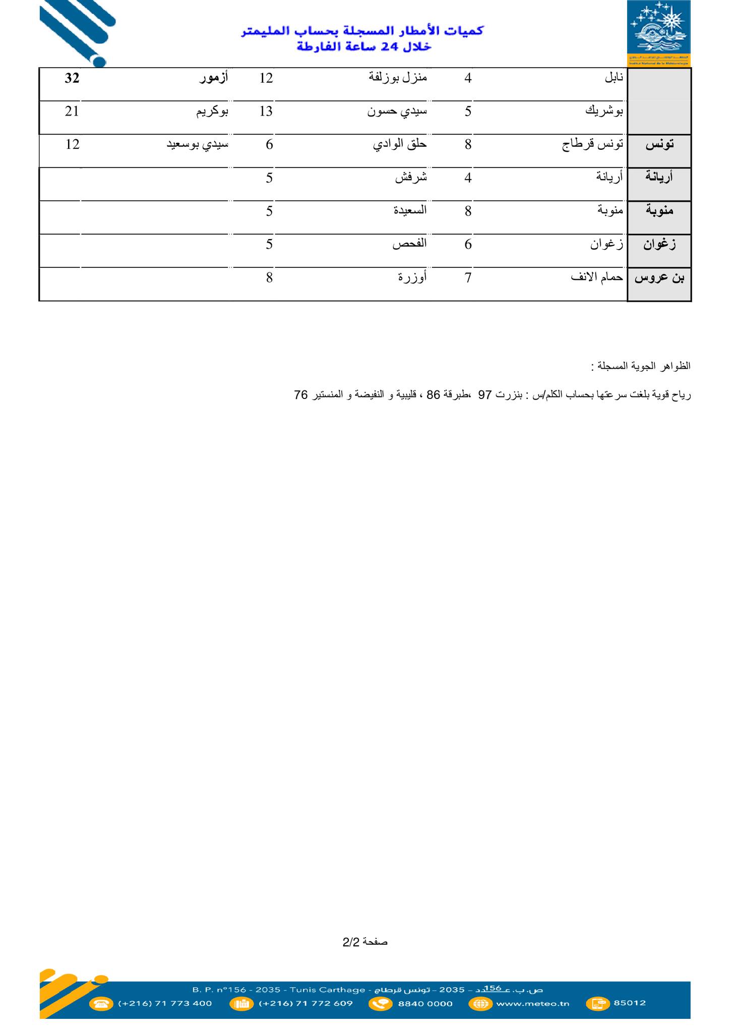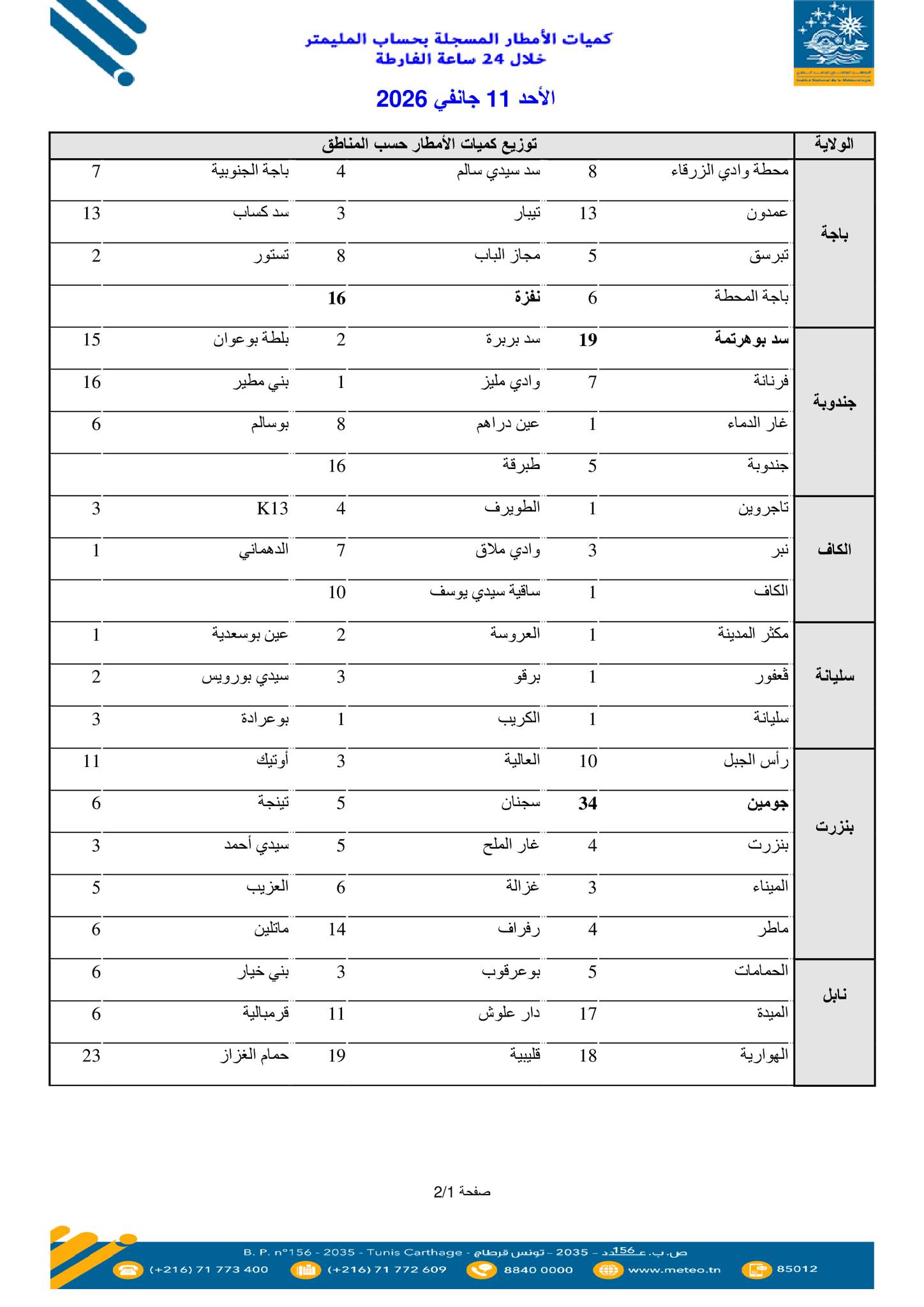 وفي ما يلي الكميات المسجلة بالتفصيل وبحساب المليمتر:
