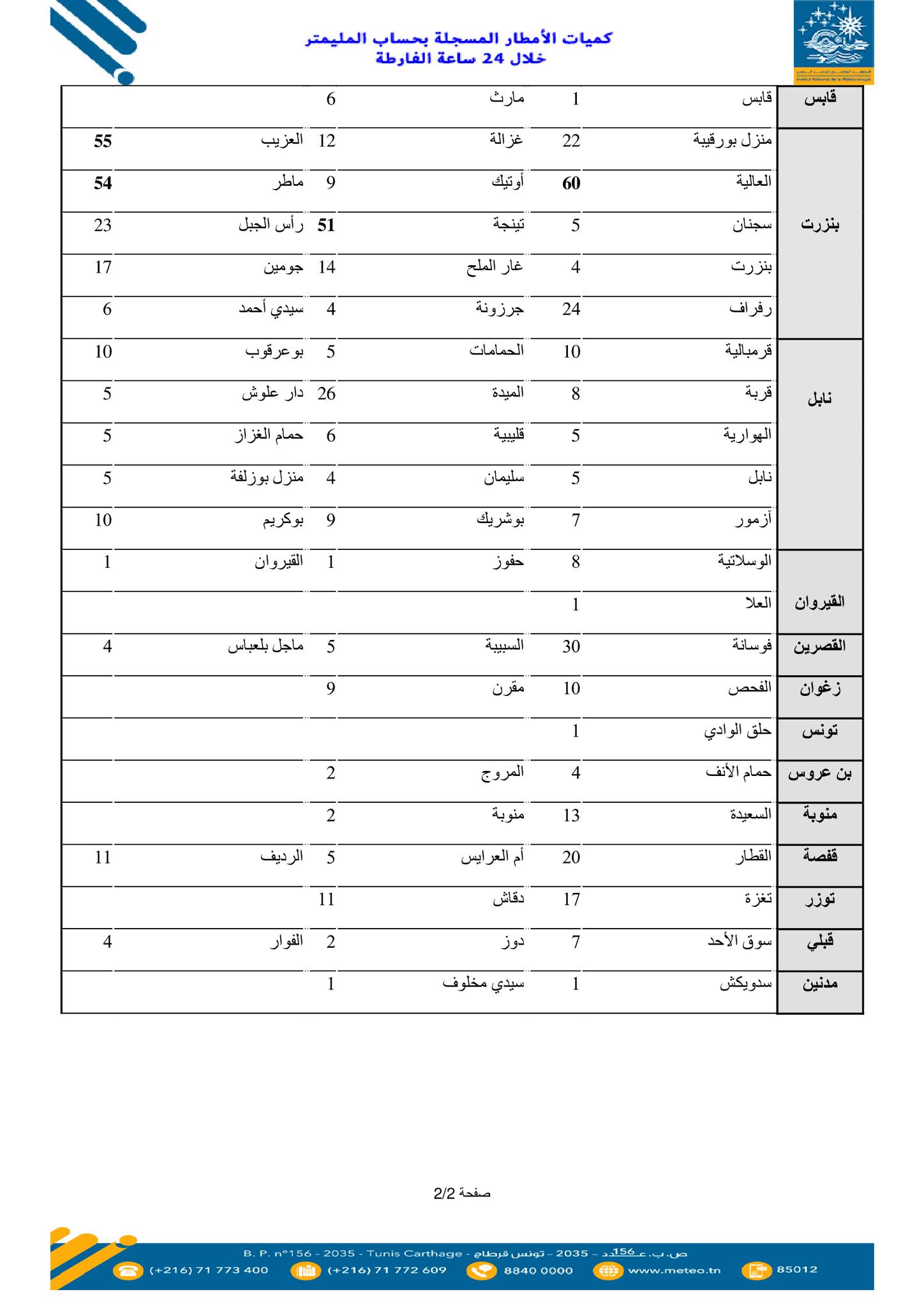 وبلغت أعلى الكميات 60 مم، وذلك في منطقة العالية التابعة لولاية بنزرت.