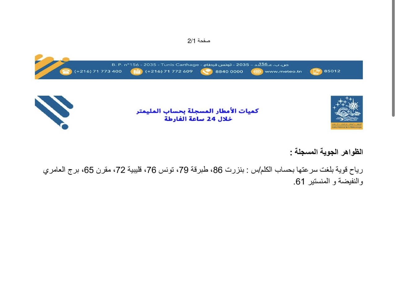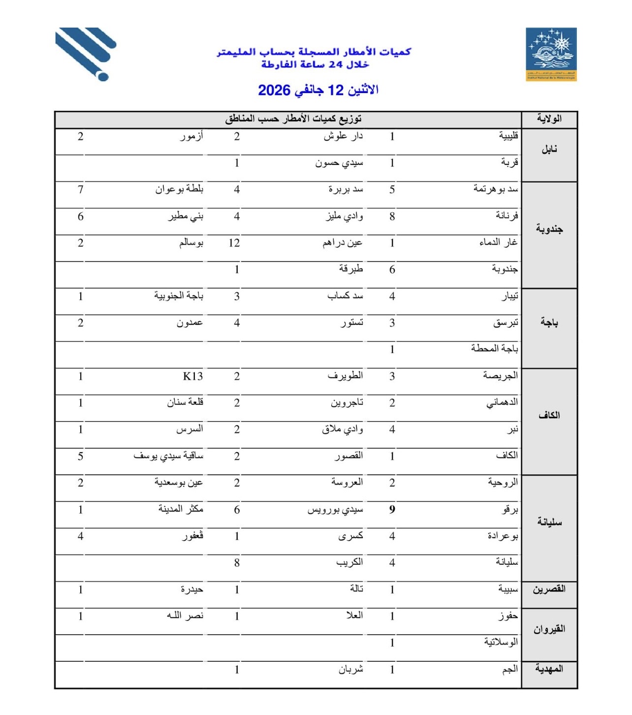 سجلت بعض المناطق خلال الـ24 ساعة الماضية، تهاطل كميات متفاوتة من الأمطار بلغ أقصاها 12 مليمترا بعين دراهم من ولاية جندوبة، وفق نشرة متابعة للمعهد الوطني للرصد الجوي.