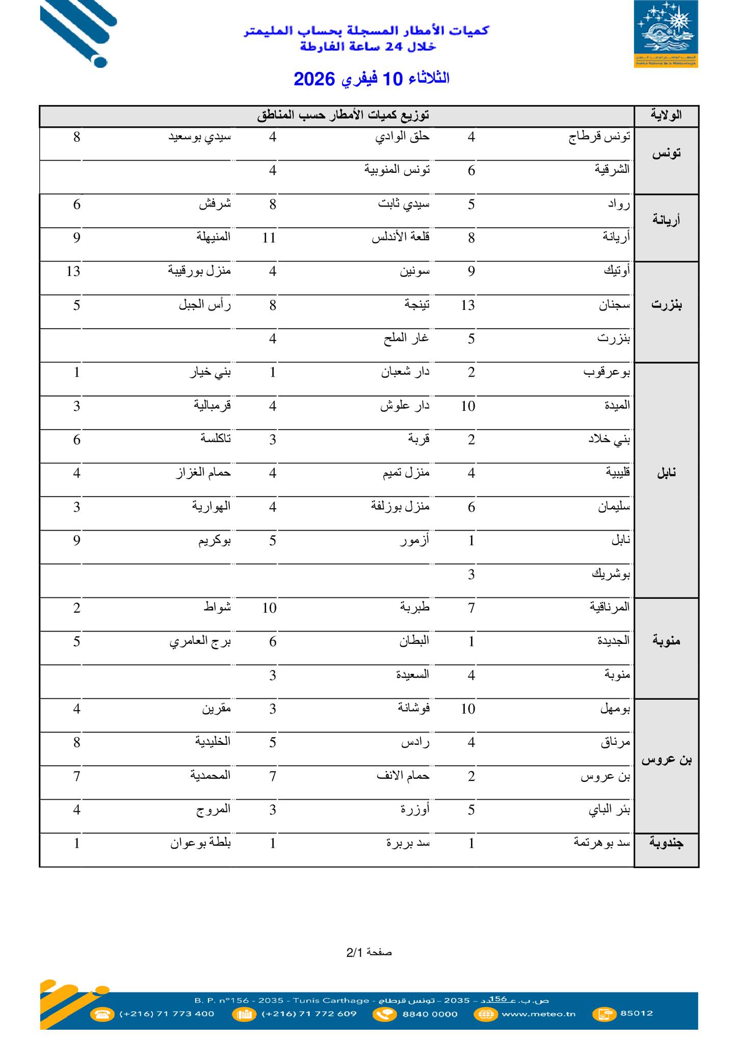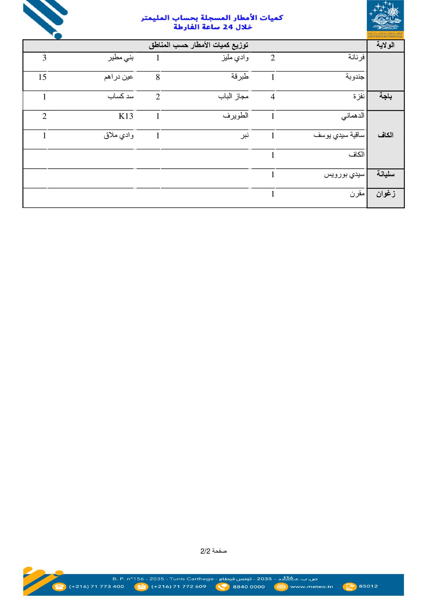 وفي مايلي كميات الأمطار المسجلة بحساب المليمتر وحسب الولايات: