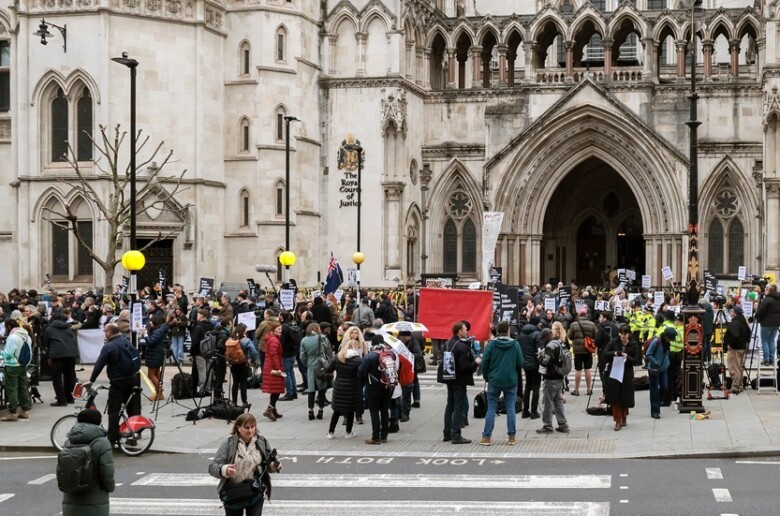 ورفع عدد من المتظاهرين لافتات كتب عليها “هذا عرض لا محاكمة” و”أطلقوا سراحه فورا”، و”حرية التعبير على المحك”، و”لا لتسليمه”. وخرج نشطاء حقوق الإنسان وممثلو نقابة الصحفيين إلى منصة مرتجلة خارج المحكمة، مطالبين الرئيس الأمريكي جو بايدن بإسقاط التهم الموجهة إلى الصحفي الأسترالي. وكان من بين المتظاهرين الزعيم السابق لحزب العمال البريطاني جيريمي كوربين، ووالد أسانج جون شبيتون وأخوه غير الشقيق غابرييل شبيتون، اللذان جاءا من أستراليا لحضور المحاكمة.