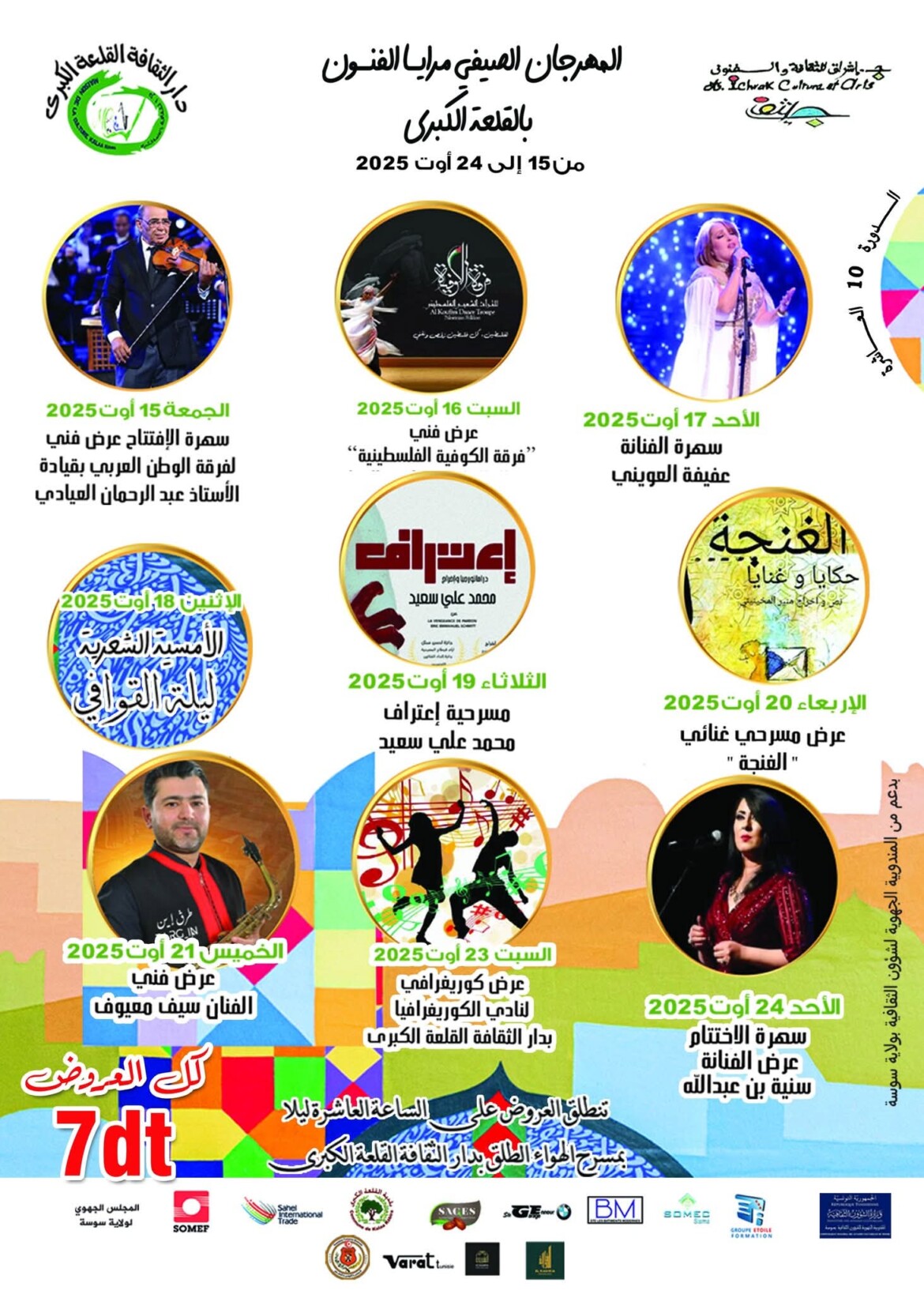 تحتضن مدينة القلعة الكبرى الدورة العاشرة من مهرجان مرايا الفنون، من 15 إلى 24 أوت 2025.