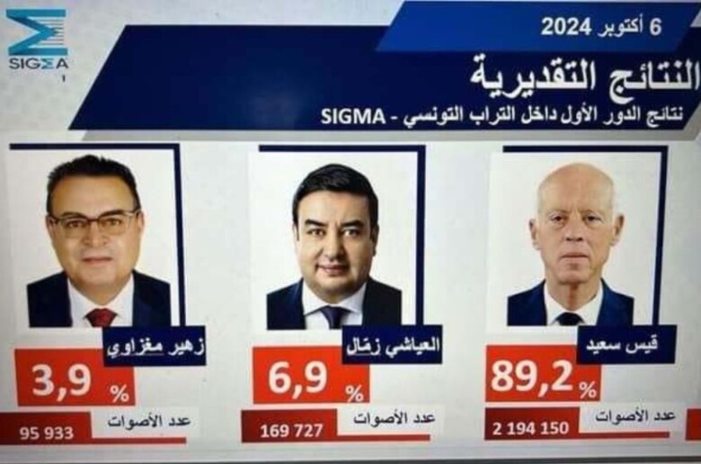 صوت 89.2 بالمائة من الناخبين الذين أدلوا بأصواتهم في الداخل في الاستحقاق الرئاسي لصالح المترشح قيس سعيد حسب تقديرات لشركة سبر الآراء سيغما كونساي أعلن عنها مدير الشركة حسن الزرقوني.